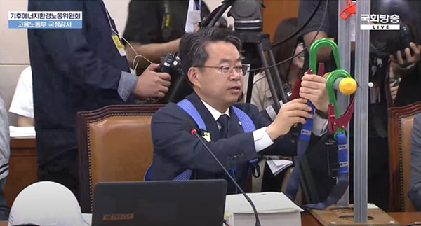 On October 15, the parliamentary inspection of the National Assembly's Climate, Energy, Environment and Labor Committee introduced a smart safety technology that prevents falls by using artificial intelligence (AI) to monitor whether safety rings are fastened in real time when high-risk tasks such as complaints are performed.